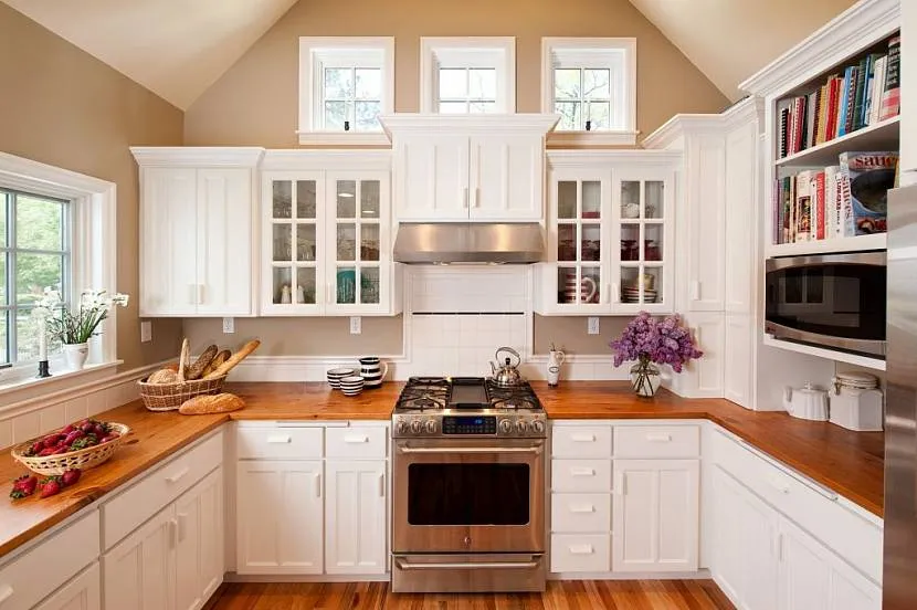 Определитесь не только с отделкой и цветовой гаммой гарнитура, но и с материалом, из которого будет выполнена рабочая поверхность. Наиболее востребованы деревянные столешницы. Для ванильного кухонного интерьера это лучшее решение. Выбирайте столешницу, которая будет соответствовать всему дизайну интерьера. Если цвет фартука нейтрален, она может иметь любой колер.
