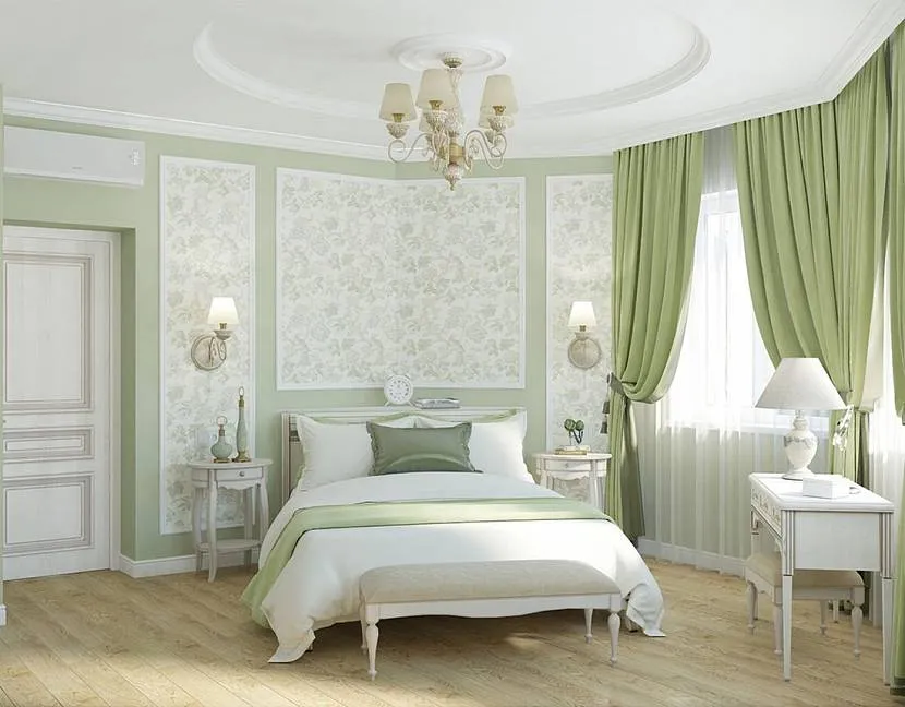 Красиво смотрятся зеленые спальни в стиле классика. Светлая палитра делает компактное пространство более объемным. В интерьере запрещены ядовитые варианты гаммы. Нежный лимонно-кремовый сочетают с теплым желтым и золотым. Приглушенный фисташковый комбинируют с коричневыми узорами, пастельный мятный – с голубыми.