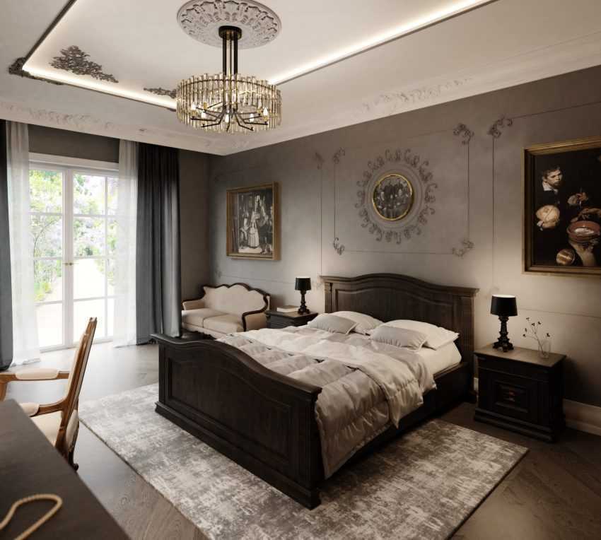 На фото окрашенные черные стены, декорированные молдингами и лепниной в интерьере спальни в стиле неоклассика.
