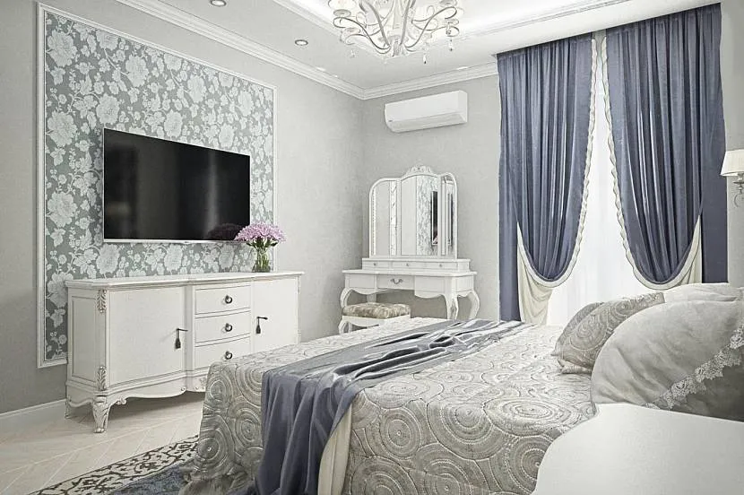 Для спальни в современном классическом стиле используют пастельный голубой. Приглушенный цвет основного фона сочетают с белым на шторах, в гарнитуре и на кровати. Если помещение темное, то добавить тепла помогут оттенок слоновой кости или мягкий кремовый. Тона с легкой желтизной делают комнату более уютной.