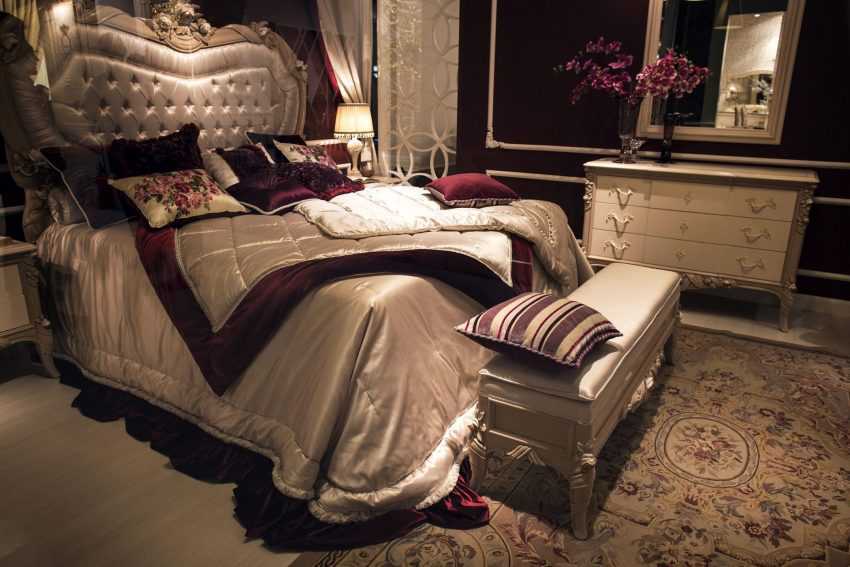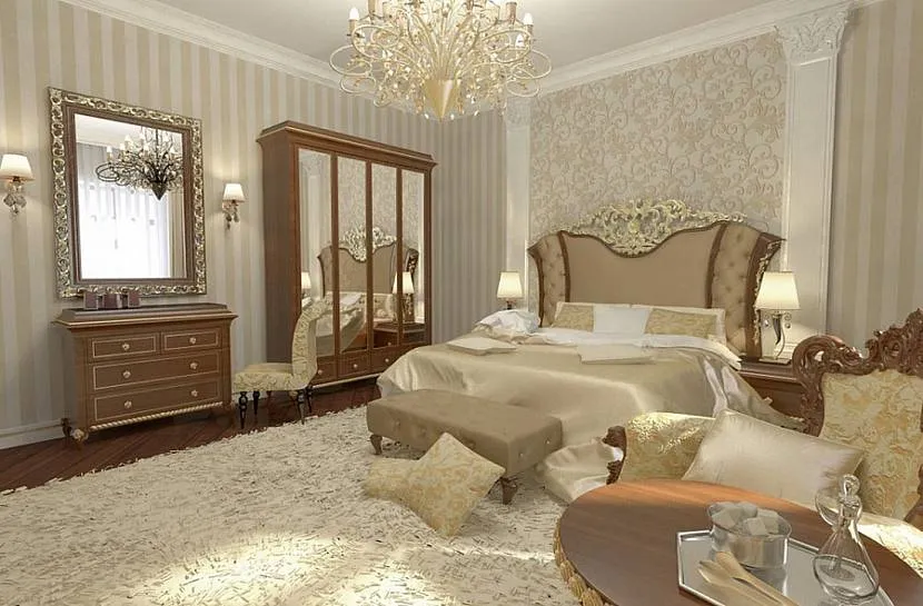 Все предметы мебели должны быть выдержаны в одном стиле, содержать элементы резьбы и рельефные накладки. Очень красиво в интерьере таких спален смотрятся изделия с позолотой.