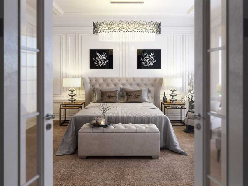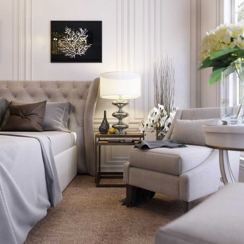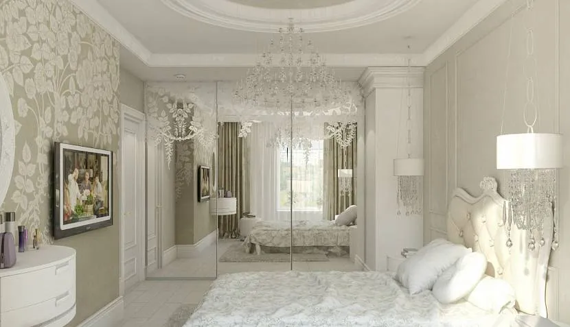 Для отделки комнаты для сна используют нейтральную светлую гамму. Стандартный белый выглядит слишком просто и лаконично, поэтому цвет комбинируют с теплым бежевым на занавесках, ковре и в мебели. Снежные стены сочетаются с нежными кремовыми узорами обоев. Чтобы интерьер воспринимался дорого, уместна позолота. Блестящие детали встречаются в орнаменте текстиля, молдингах и фурнитуре.