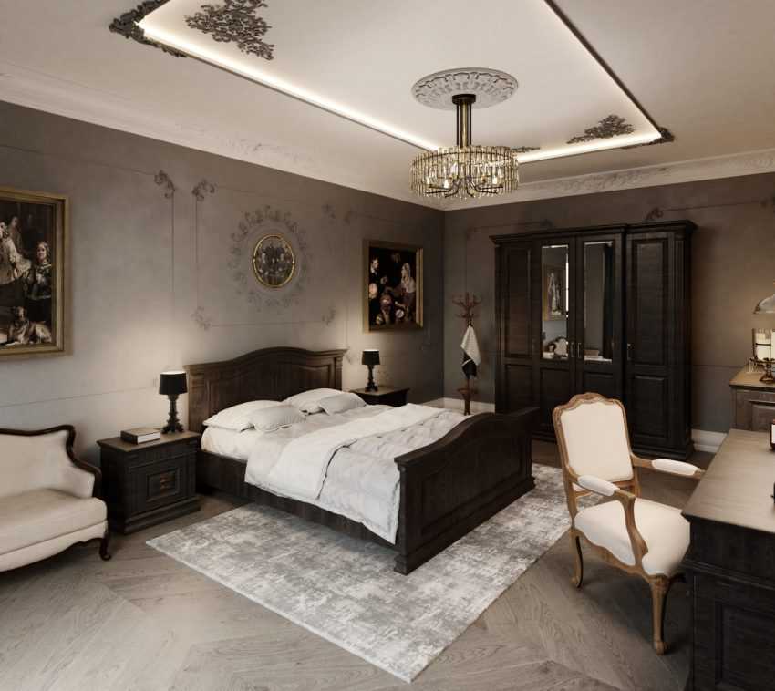 - Потолок. В оформлении потолочной поверхности используют штукатурку, оклеивают ее обоями и декорируют лепниной. Для подобного интерьера подойдет натяжное пленочное, тканевое полотно или разноуровневая гипсокартонная конструкция со встроенной подсветкой. Радикальной дизайнерской идеей станет графитовый потолок, способствующий созданию неожиданного визуального эффекта и загадочной атмосферы.