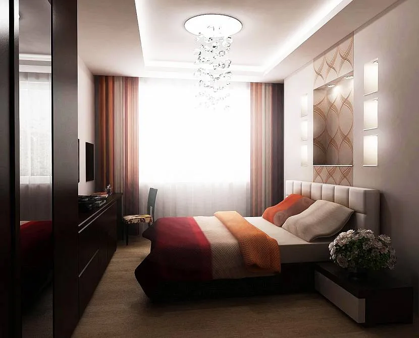Удобное зонирование. В малогабаритных спальнях стараются не конструировать искусственные перегородки. Зонирование проводится с помощью акцентов, предметов мебели, отделочных материалов.