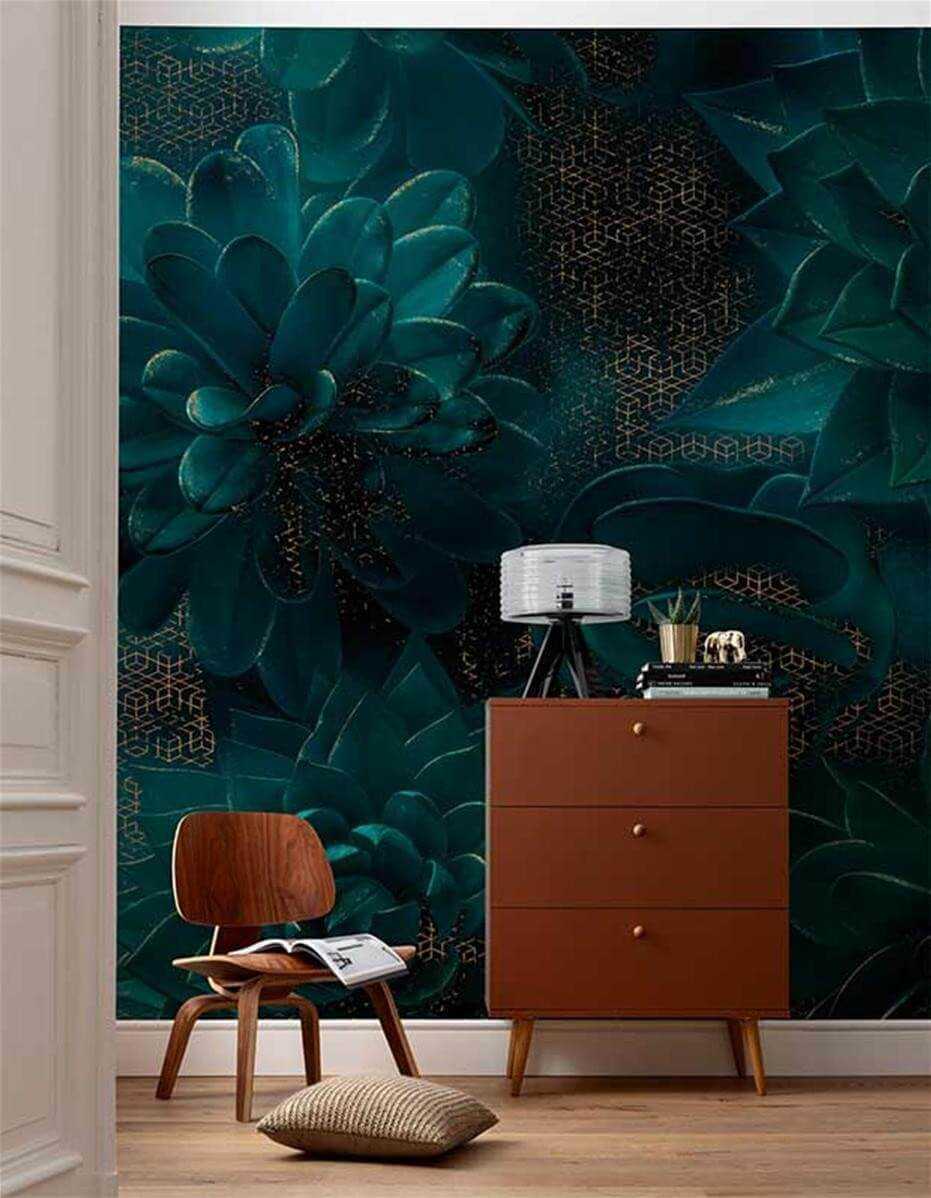 Глубокий тёмно-бирюзовый в сочетании с белым и терракотовым — идеальная пара для оформления рабочей зоны или релакс-уголка. Фото Muraem.com