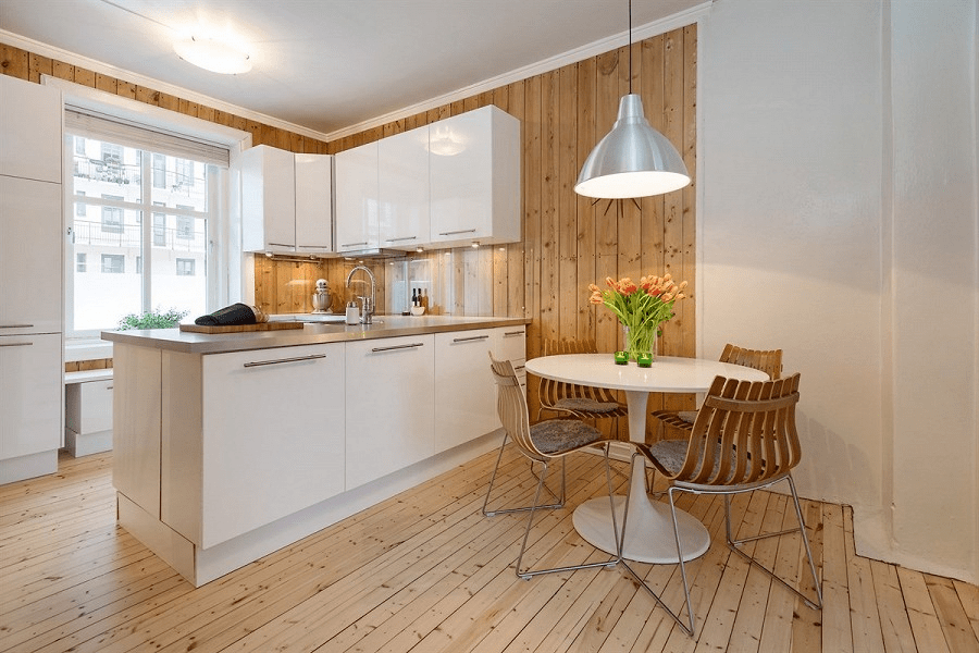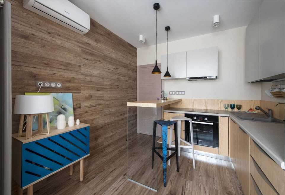 В кухне небольшой городской квартиры лучше делать не сплошную обшивку, а чередующуюся с окрашенной или оклеенной обоями поверхностью. Да, дерева будет немного, но зато оно не будет «давить» и вызвать ассоциации с деревянным гробом.
