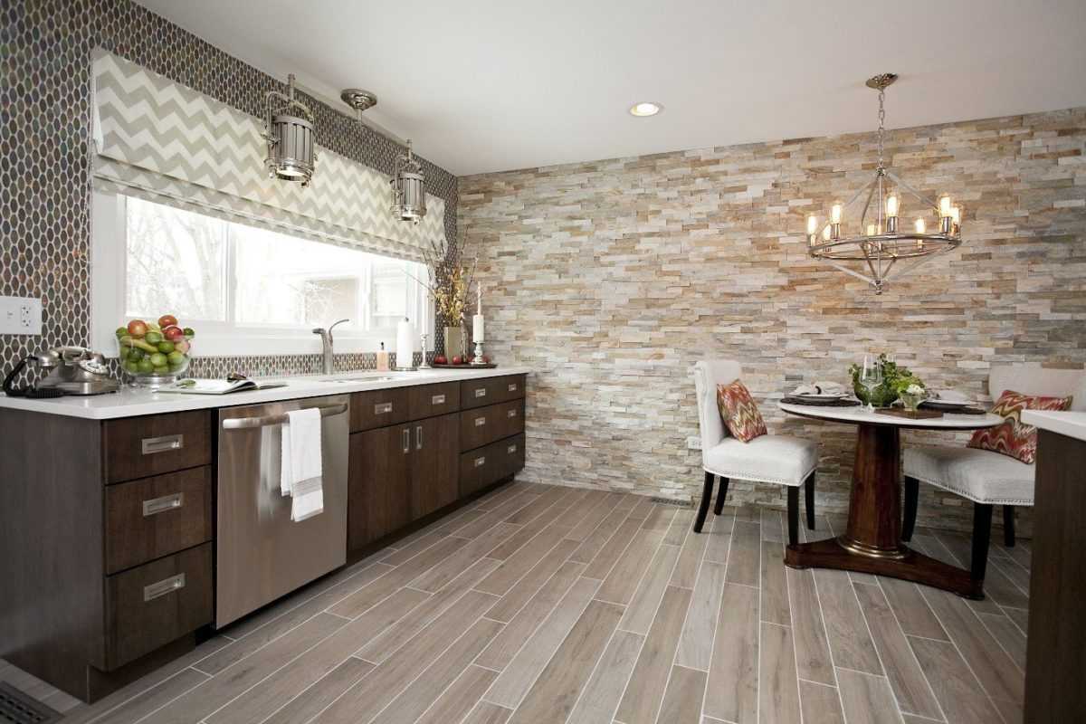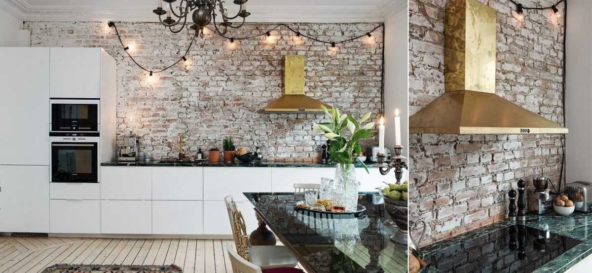 Современная керамическая плитка имитирует любые природные материалы, в том числе обожжённую глину. Отделка стен под кирпич — оригинальный вариант ремонта на кухне.