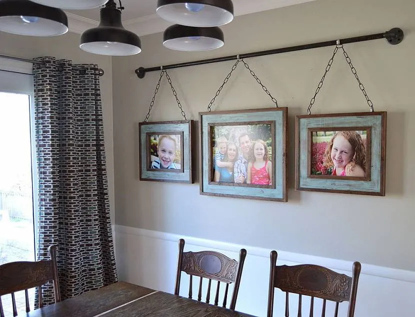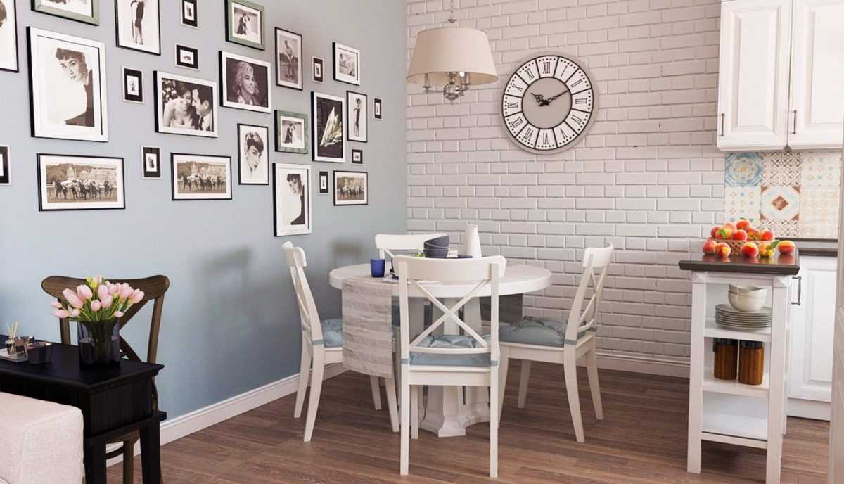 Кухня со старинным оформлением. В таких интерьерах целесообразно декорировать стену у зоны обеденного стола деревянными рамами с фото. Приемлемо использовать только широкие подходящие по цвету экземпляры. Чтобы создать радостную обстановку, применяют цветные снимки. Их красиво вывешивают на небольшие петли-цепи. Подобное оформление подходит для дома, где очень важны семейные ценности.