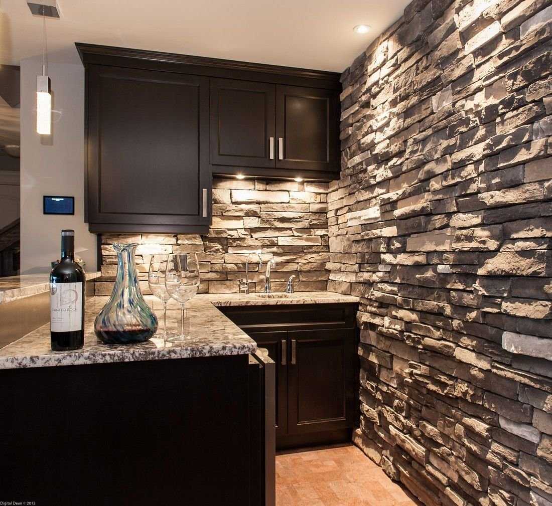 Стена, у которой расположен стол или барная стойка может быть оформлена разными способами, от самой простой и нейтральной отделки под покраску или обои, до оригинальной с использованием декоративной штукатурки, деревянных или мдф панелей, кирпичной кладки. Главное, чтобы поверхность возле стола была практичной и легко очищалась.