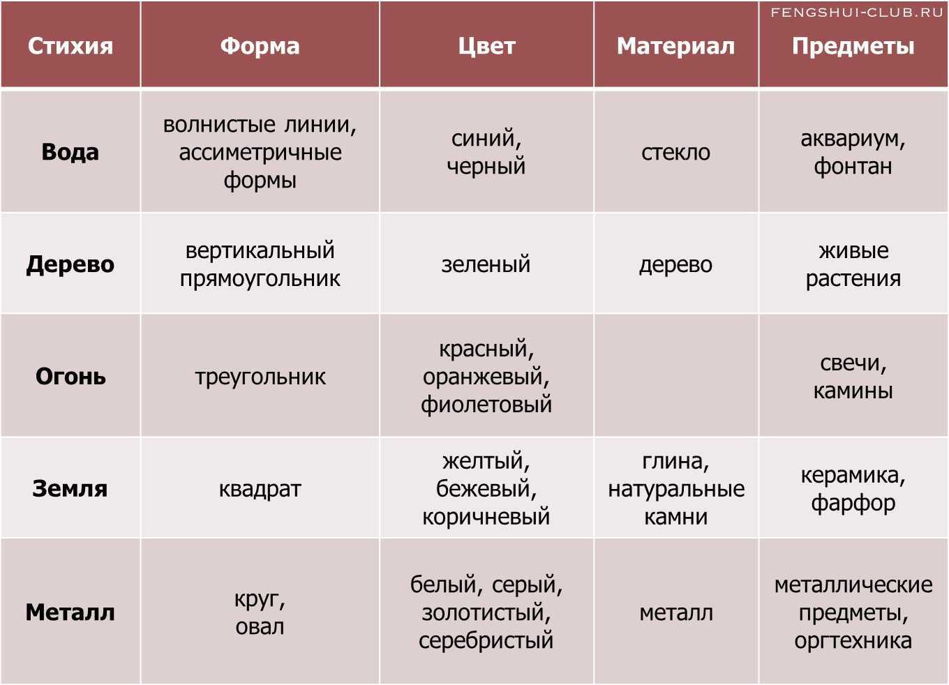 Для удобства мы составили таблицу, которая поможет сориентировать, что добавить в интерьер по Фен Шуй.
