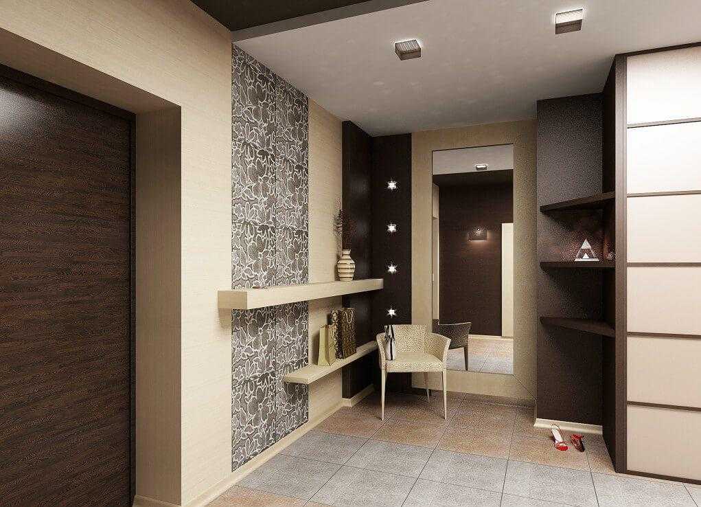 Вопрос о количестве цветов в дизайне рассматривается вместе с учетом параметра геометрической правильности прихожей, ширины и высоты ограждающих элементов, их габаритов.
