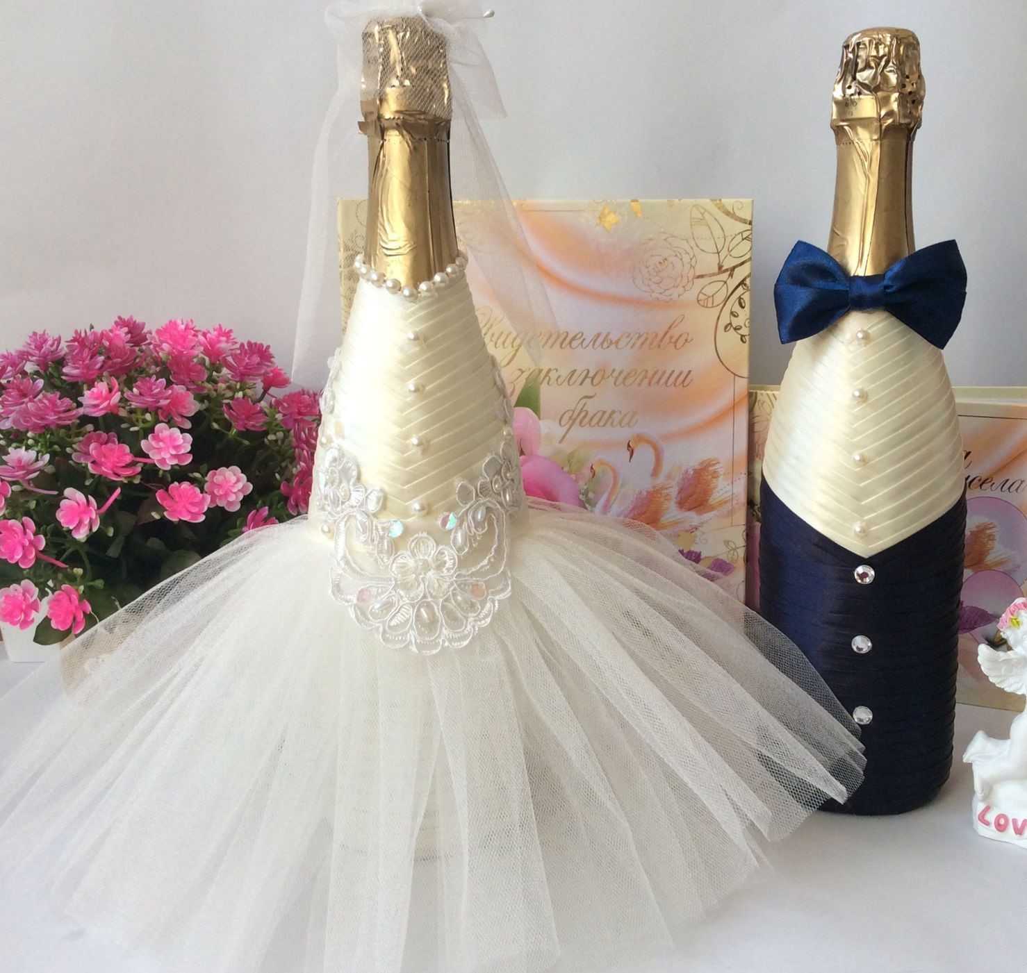 3. Украшение бутылок свадебными нарядами, соблюдая всю атрибутику. Для этого может понадобится тесьма, ленты, фатин, бусины, стразы, банты и кружева: