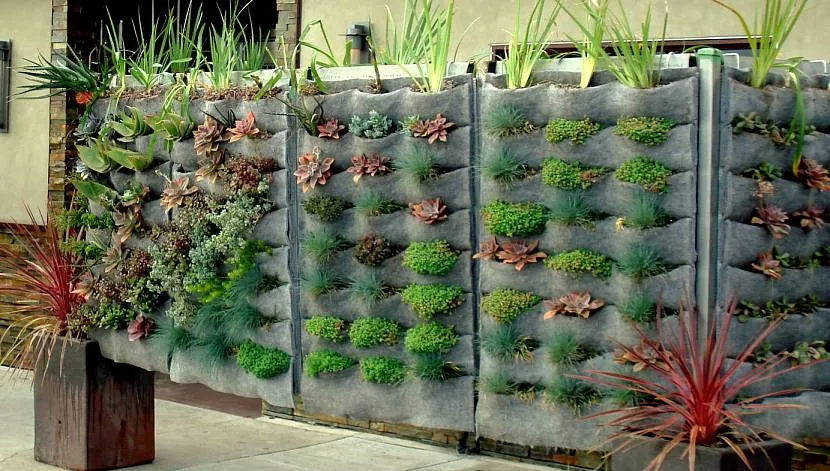 Мешки с кармашками — сшить их не так уж сложно. Нужна плотная ткань, хорошо пропускающая воздух, способная выдержать достаточный вес, прочные нитки. На полотно нашиваются карманы, в которые должны вмещаться горшки для растений. В верхней части полотна делаются петли для крепления конструкций к стене или решетке.