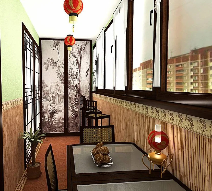 - для японских мотивов дизайна балкона используйте бежевые тона и балки темных тонов;