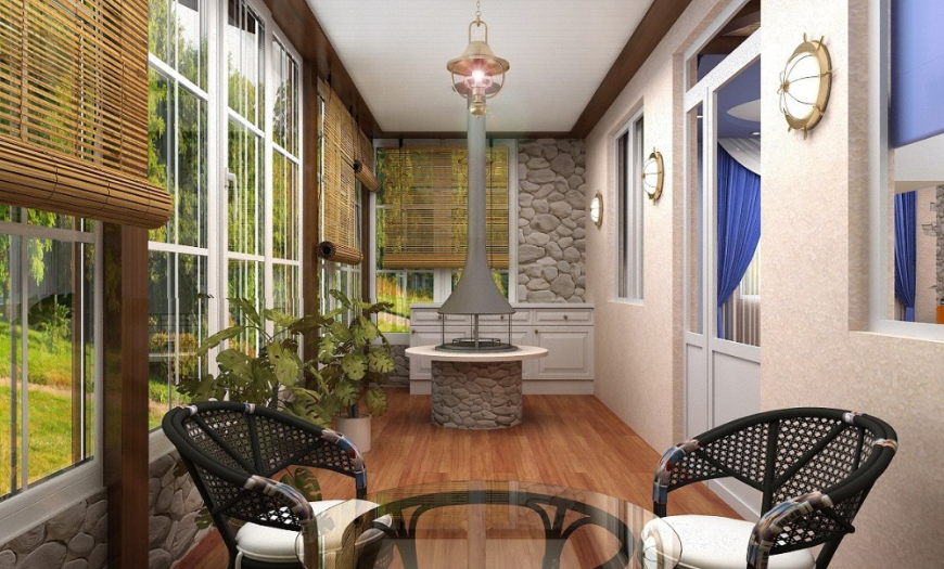 - эко-дизайн балконного помещения включает в себя природные тона, бамбуковые, соломенные, каменные предметы интерьера и отделки.