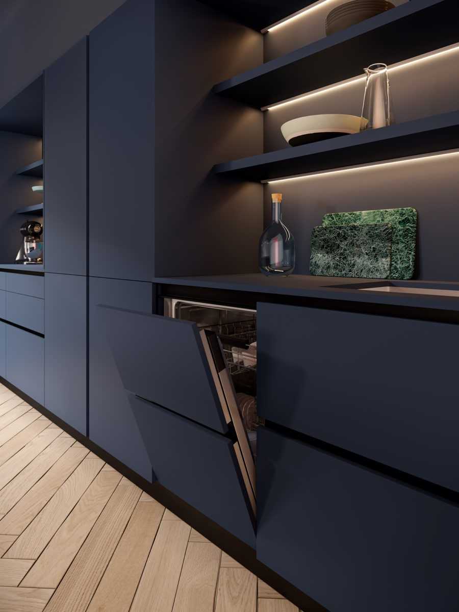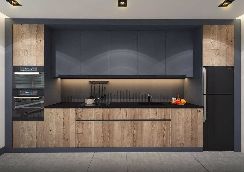 В современной стилистике гарнитур в основном обладает гладкими прямоугольными фасадами без ручек. В изготовлении столешницы применяется натуральный или искусственный камень, реже массив древесины. Черную мебель выгодно дополняют монохромной белой, серой или бежевой отделкой.