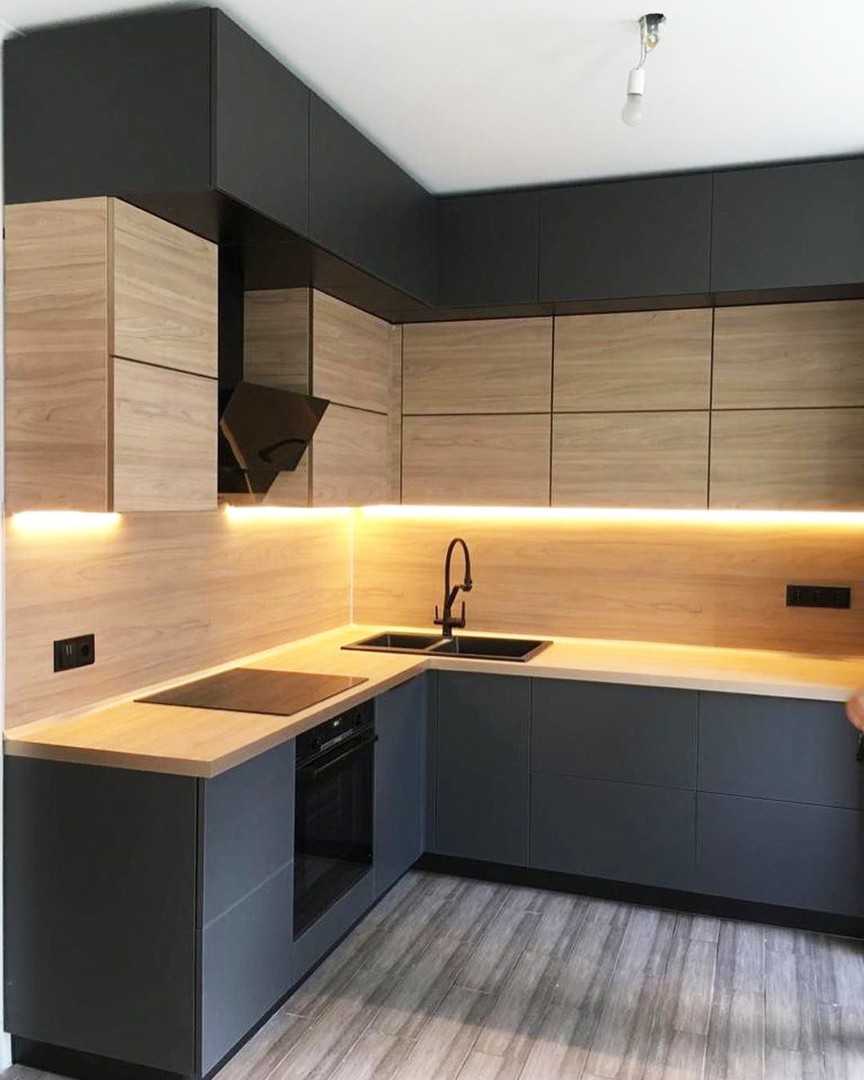 На фото фартук черного цвета, разделяет рабочую зону на две части, визуально удлиняет пространство.