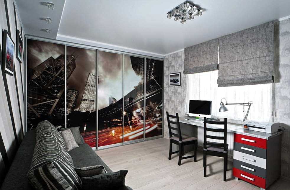 Такой дизайн является универсальным. Мебель нужно выбирать удобную и функциональную без лишнего декора. Ярким акцентом в такой комнате может быть стул интересного дизайна или фотообои. Современный стиль в детской отлично подойдет школьнику.