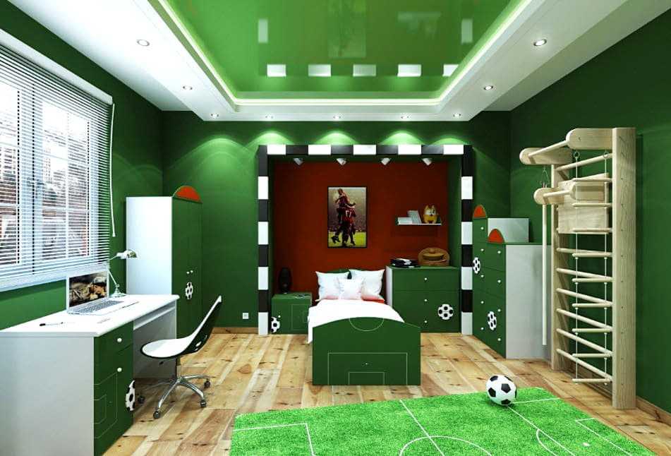 На фото комната для парня на тему футбола. Стены отделаны зелеными жидкими обоями с имитацией футбольного поля.