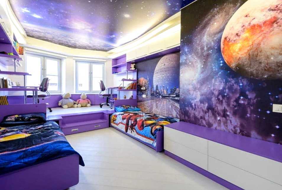 Немного сложнее обстоит дело с оформлением комнаты для двух мальчиков. Но и тут нет ничего невозможного: художники даже придумали варианты дизайна в стиле «унисекс». Это такое оформление пространства, в котором есть место и для дочери, и для сына. А уж для двух парней найти что-то общее еще проще.