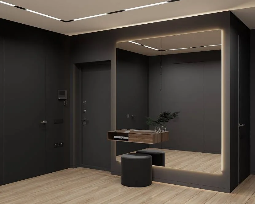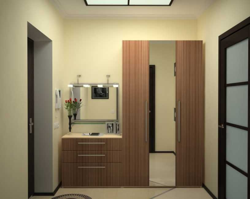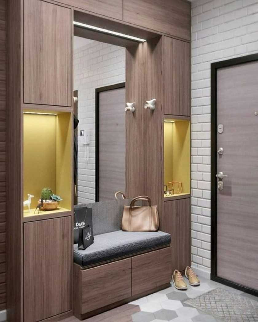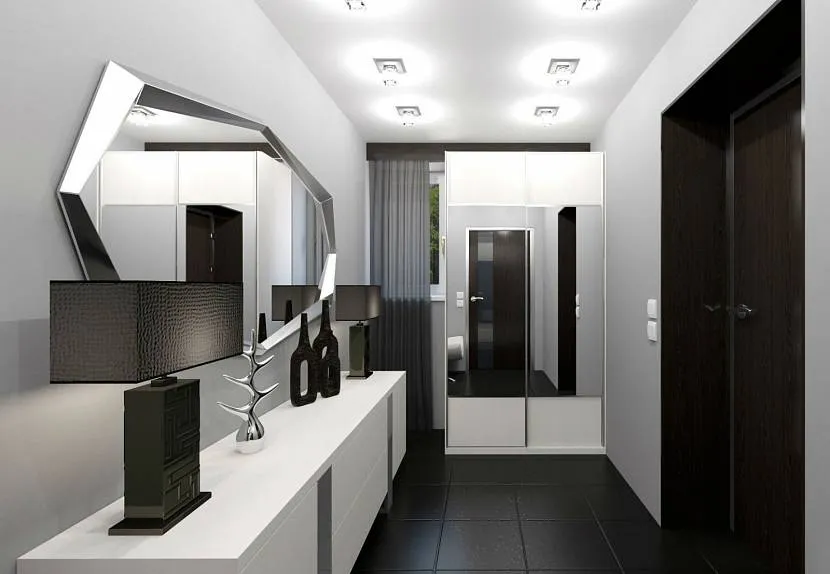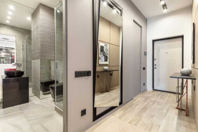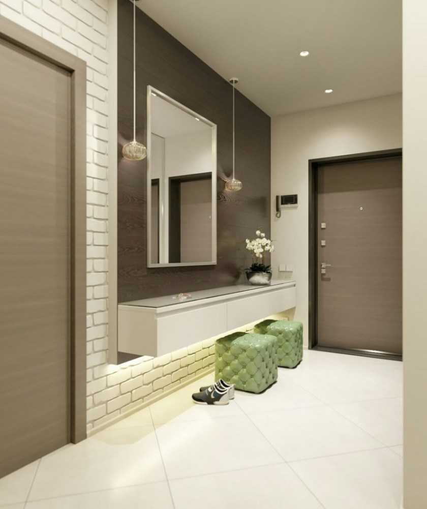 - в конце помещения устанавливается узкая банкетка, столик или консоль с зеркалом.