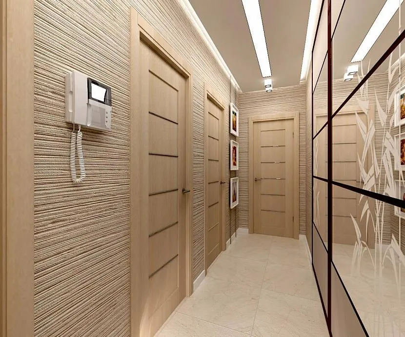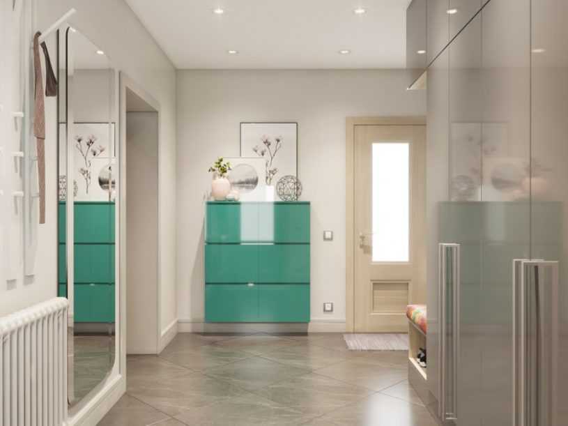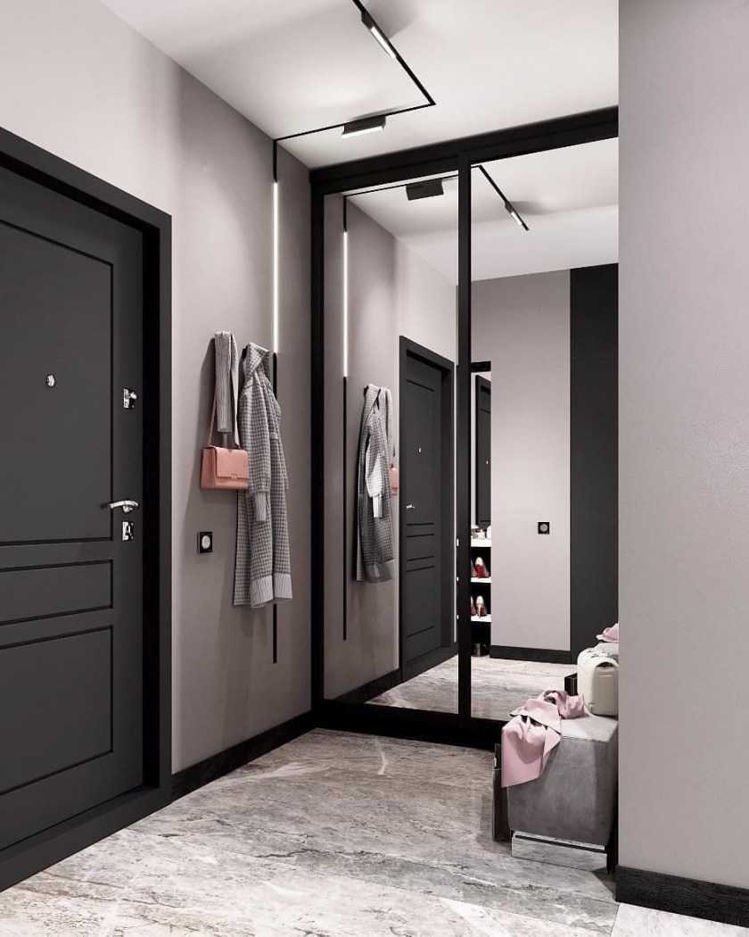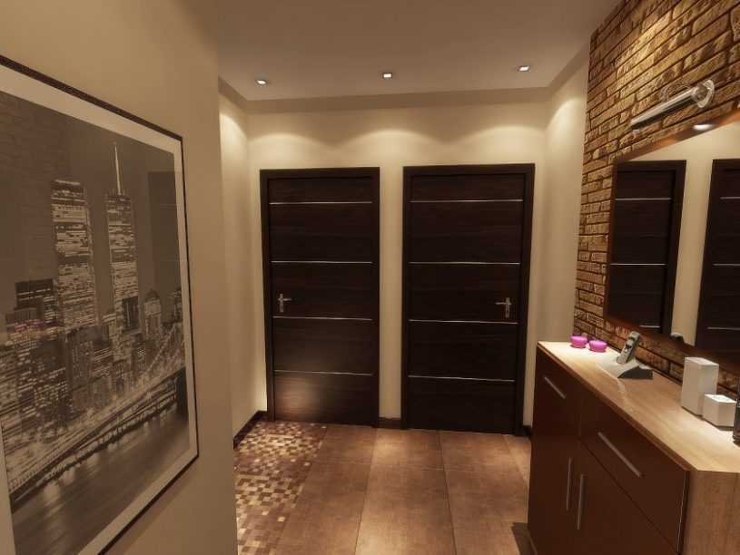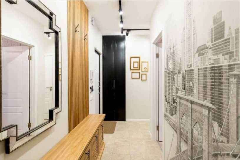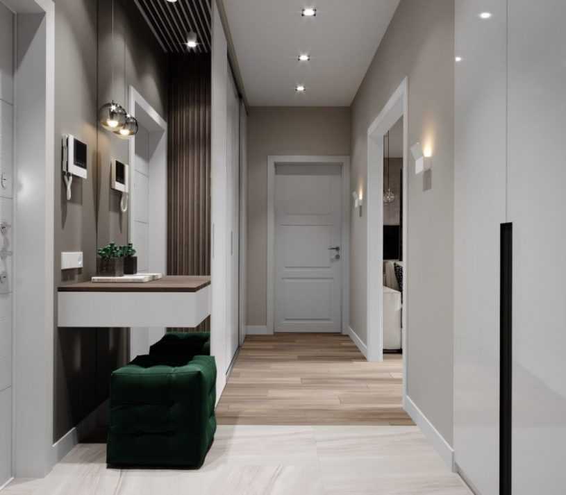 Главный недостаток — отсюда хорошо видны все комнаты в квартире. Чтобы решить эту проблему, нужно закрыть дверь каждой из комнат. Наиболее распространенный способ перепланировки коридора такого типа — разделение его на две функциональные зоны.
