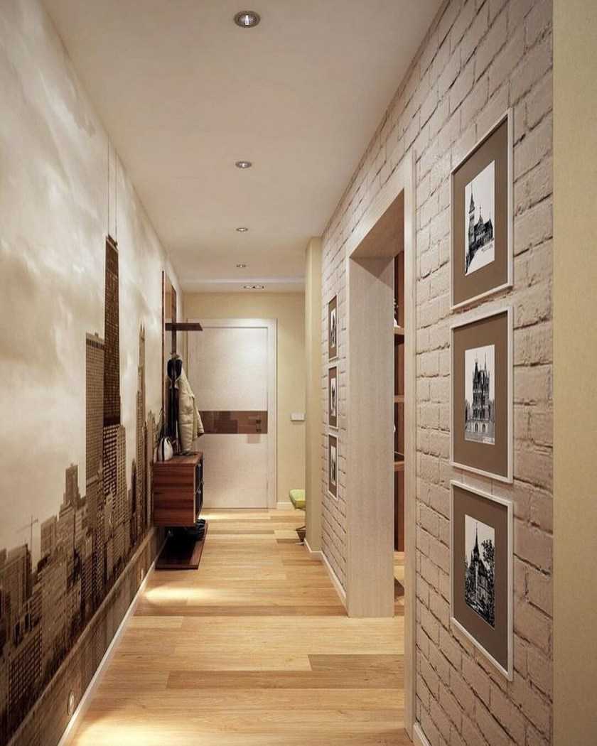 Если коридор длинный и узкий, лучше разделить его на две зоны. Один из них будет служить коридором, второй — холлом. Создавать зонирование пространства можно с помощью разных отделочных материалов. Подходящим покрытием для зоны у входа будет плотный линолеум, а для холла — паркет или ламинат.