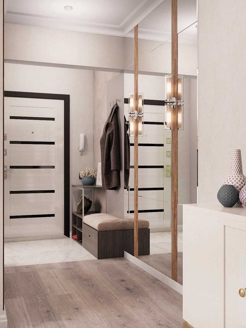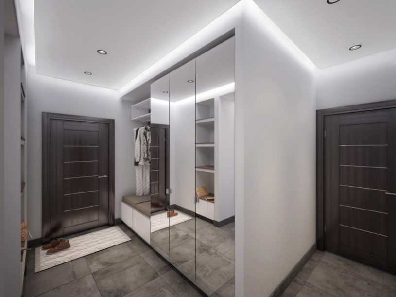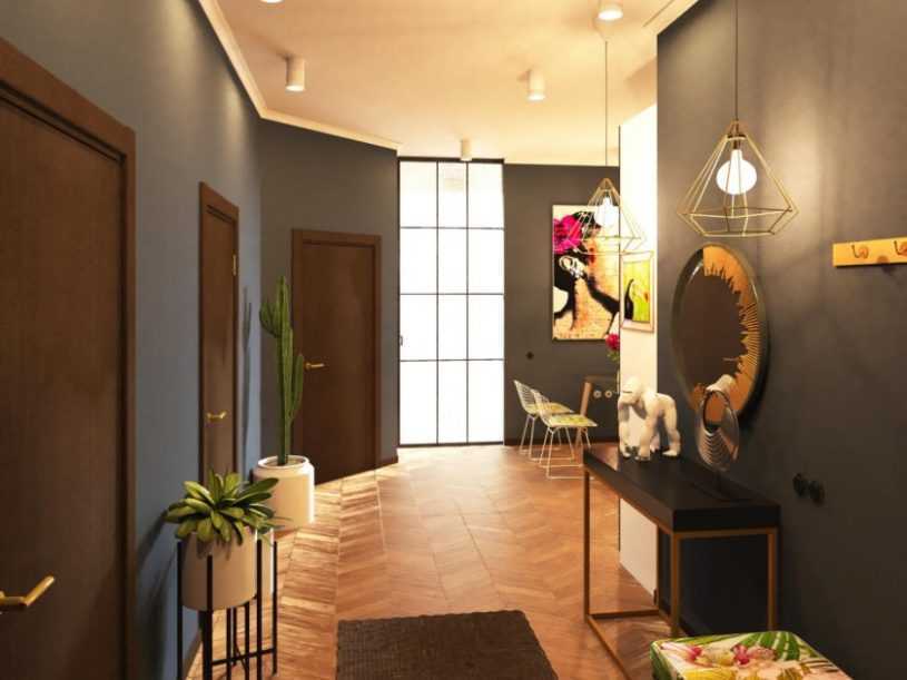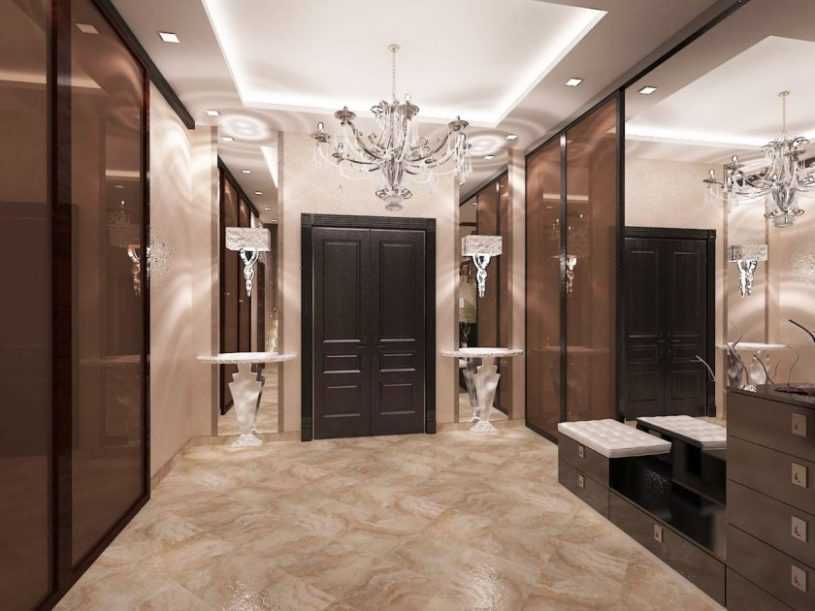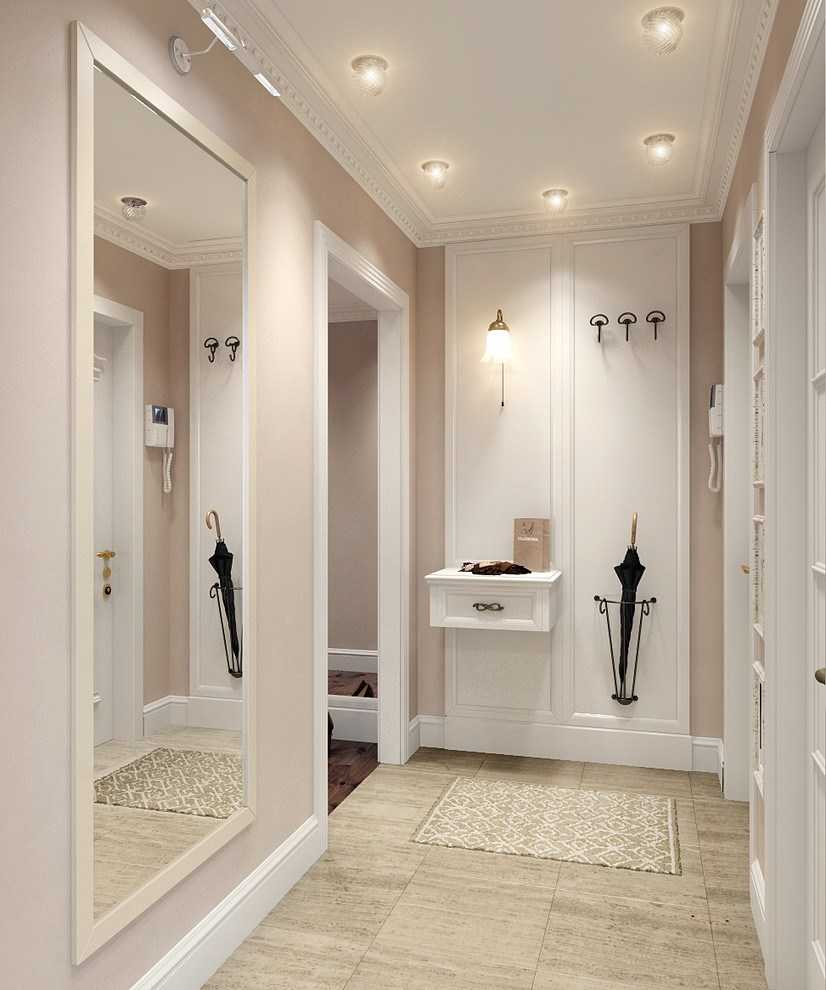 Прихожую можно украсить красивым шкафом-купе с большим зеркалом и многоуровневой подсветкой. Зону отдыха дополнит мягкая мебель, журнальный столик, предметы декора: статуэтки, вазы, часы или декоративные растения. Эту зону можно оформить в стиле ретро с помощью комода, картин, светильников под старину. Разделение коридора на две части можно выполнить с помощью арки, разных типов полов.