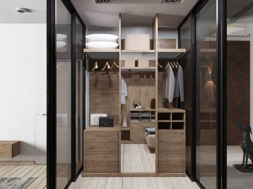 Проще всего обставить помещение квадратной формы, которое выглядит просторней, чем прямоугольное, имеющее ту же площадь. Подобрать мебель не составит труда: для хранения одежды и обуви отлично подойдет угловой или прямой шкаф.