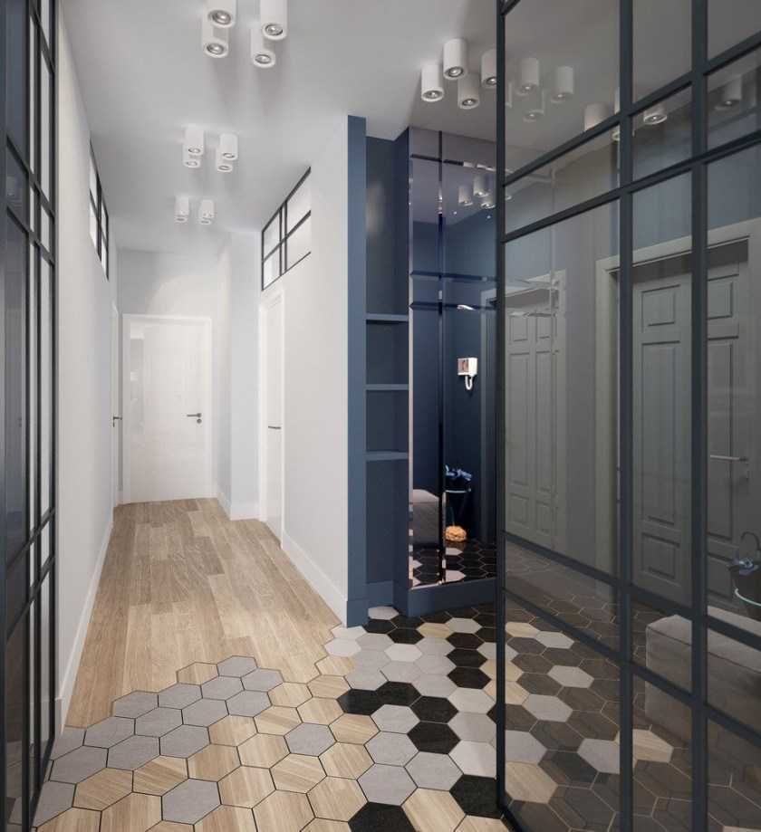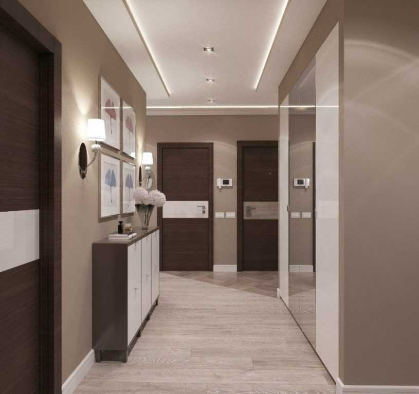 Интерьер узкого коридора будет смотреться эффектнее, если сочетать разные цвета и фактуры пола. Если уровень пола в зоне входа будет немного ниже, чем в остальных комнатах, коридор будет отделен от других частей квартиры.
