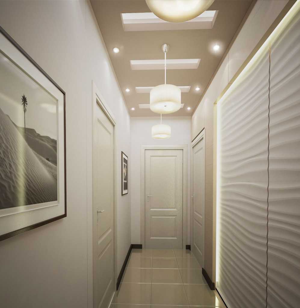 Потолок. Коридор, выдержанный в стиле минимализм, не требует особых изысков в дизайне потолка. Достаточно натяжного полотна или побелки. Чтобы визуально приподнять верх помещения, часто используется глянцевая поверхность, а высокие потолки оформляются многоуровневыми конструкциями.