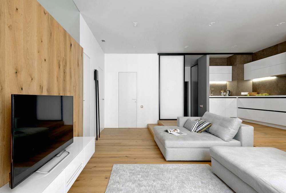 В кухне-гостиной чёткое зонирование: кухонная зона и обеденный стол — на возвышенности, ниже — зона ТВ с удобным большим диваном, который, благодаря своей простой форме и нейтральному цвету, словно сливается с интерьером. Кроме того, плоскости стены и пола тоже переходят друг в друга. Эти приёмы помогают придать интерьеру единство, целостность.