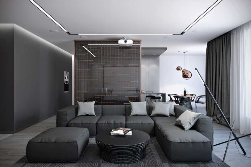 Одной из фишек, позволяющих создать современный дизайн гостиной 2022, является использование раздвижных и глухих стеклянных перегородок.