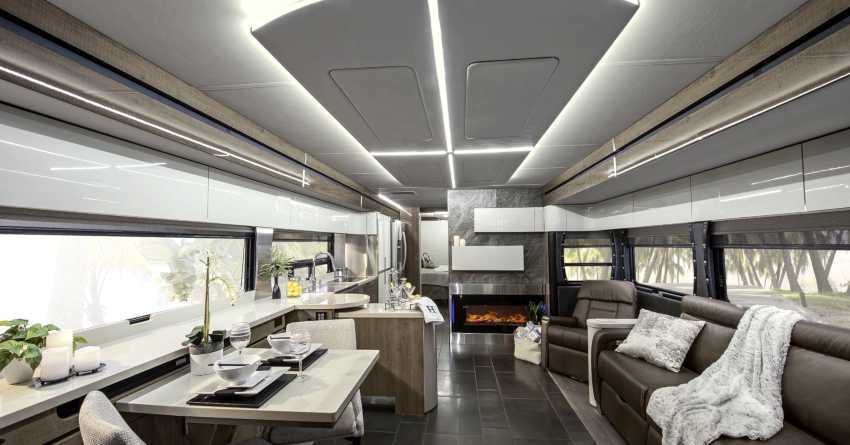 Для того чтобы зонировать современный интерьер кухни гостиной 2022, используйте абсолютно прозрачные перегородки от пола до потолка. Подойдут и раздвижные варианты.
