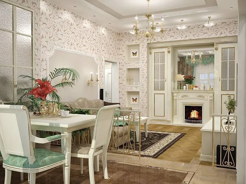 Часто выбирается для больших помещений и загородных домов. Можно установить большие мягкие кресла с диваном, поставить массивный стол из дерева и крепкие стулья со спинками. Цвета пастельные, если делаются контрасты, то исключительно в мелких деталях. Можно сделать узор на стенах, установить резные шкафчики и даже заказать мебель под старину.