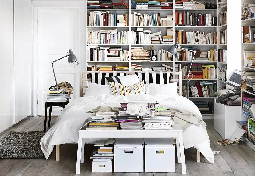 Выбирай простые и вместительные шкафы, скрывай их в нишах, откажись от ненужных полок, тумбочек, подставок и стульев