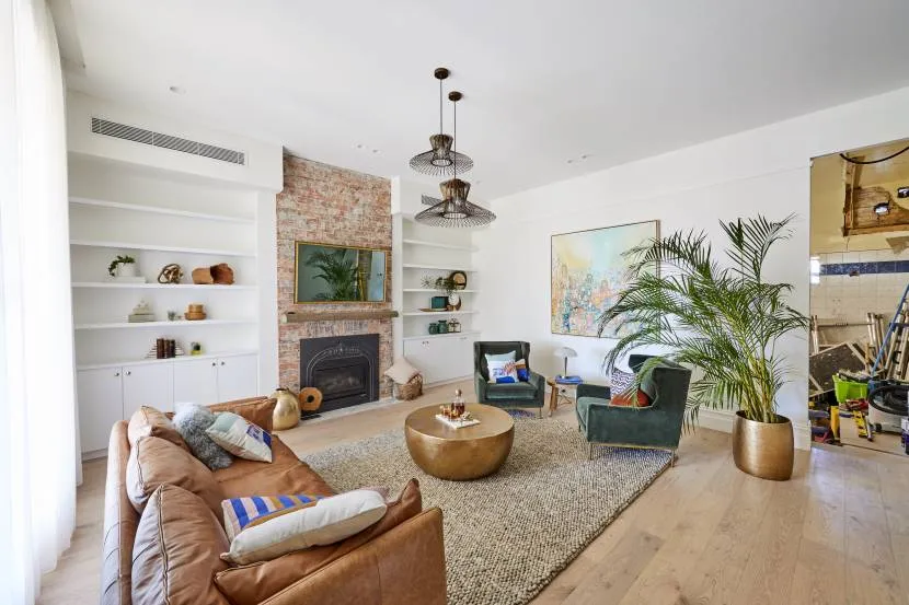 Открытые балки в комнате с каминомИсточник hgtv.com