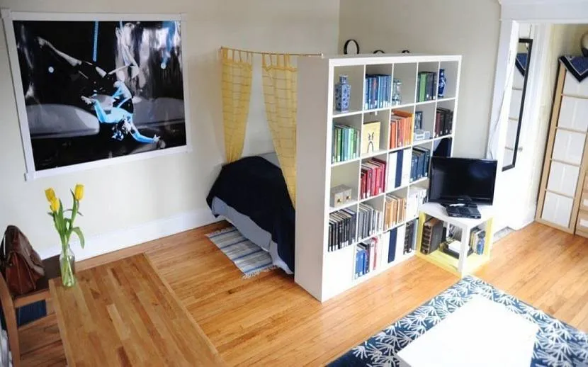 Стеллаж должен быть устойчивым. Его высота не более полутора метров. Он может быть с глухим задником или сквозными полками. Может стоять у стены в обычное время, использоваться как перегородка на вечеринке. Может разделять комнату пополам и переместиться в спальную зону перед приходом гостей, освободить место, чтобы раздвинуть складной стол.