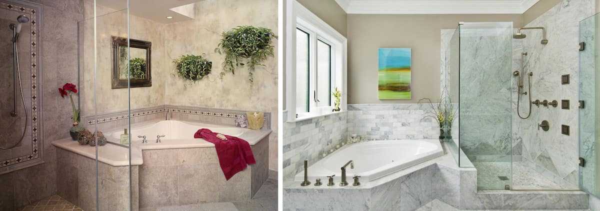 Угловая ванна хороша для классического стиля, минималистичного, стилей лофт и модерн. Они популярны и применимы повсюду – и в небольших помещениях, и в более просторных.