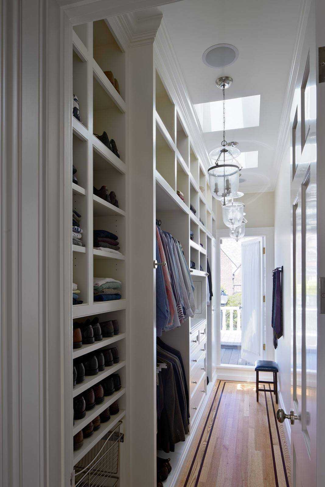 Если кладовая будет вам служить в качестве гардеробной, установите в ней все необходимое для хранения вещей так, чтобы рубашки не мялись, а обувь не теряла форму. Штанги, вешалки, полки для сумок, отделения для нижнего белья, обувные шкафчики и выдвижные секции для бижутерии – каждая деталь мебели должна быть задействована.