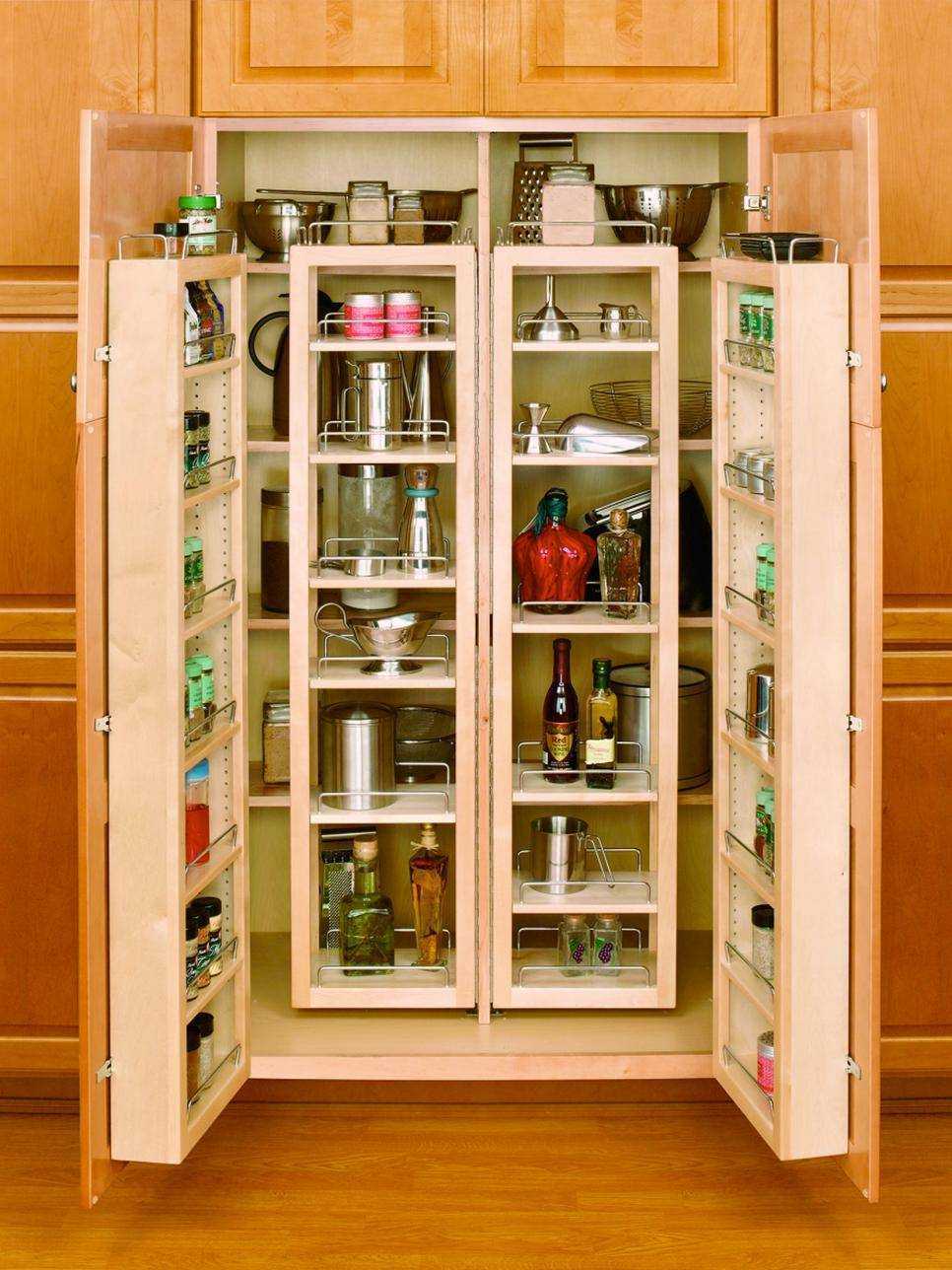 Еще один отличный способ упорядочить продукты на кухне – использовать поворотные конструкции и предусмотреть полки на дверях.
