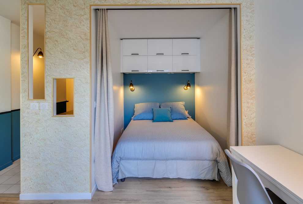 Для таких помещений применяют функциональную, нестандартную, раскладную мебель, встраиваемую в альковы, например, подъемные кровати, трансформирующиеся диваны, компактные шкафы, раздвижные столы и другие мобильные предметы.