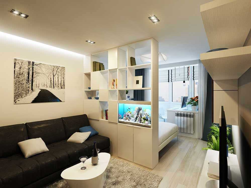 - Аквариум. Этот метод разделения потребует серьезных материальных вложений, но результат того стоит. И со стороны гостиной, и со стороны спальни есть возможность насладиться умиротворяющим видом.