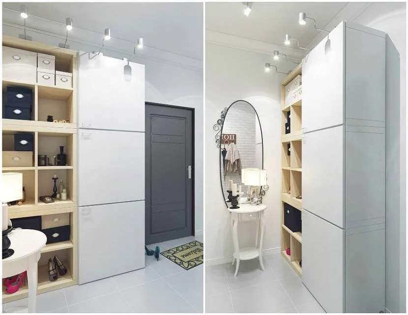 Получится зона переобувания у самого входа, зона с вешалкой для верхней одежды, где уместно большое зеркало, и зона, для которой легко найдётся применение у рациональной хозяйки. Возле дверей в санузлы можно сделать узкий шкаф для хранения швабры и моющих средств.