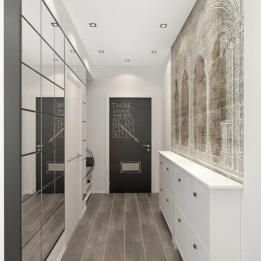 Они придадут дизайну геометричности и сакцентируют внимание на архитектурном стиле. Множество оригинальных идей дизайна прихожей можно увидеть на фото, размещенных в интернете