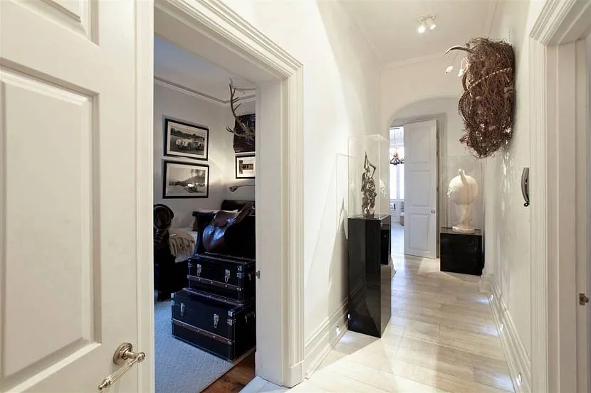 Самым популярным и легко реализуемым вариантом является выбор белых дверей, порталов, арок и плинтуса, которые перекликаются с обилием белого в оформлении квартиры. Особенно впечатляюще выглядит белая анфилада в длинном коридоре. Цвет может быть и иным. Успех обеспечен, если плинтус «перетекает» в другие помещения, организуя пространство.