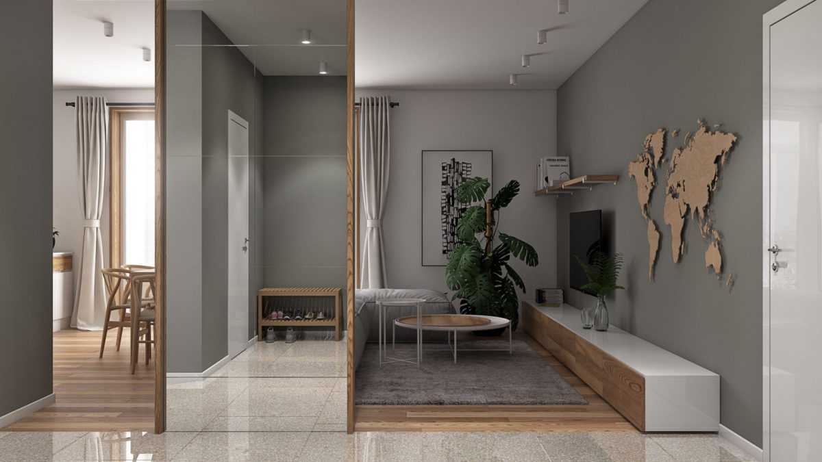 В квартире студии можно выделить зону прихожей всевозможным декором на стенах