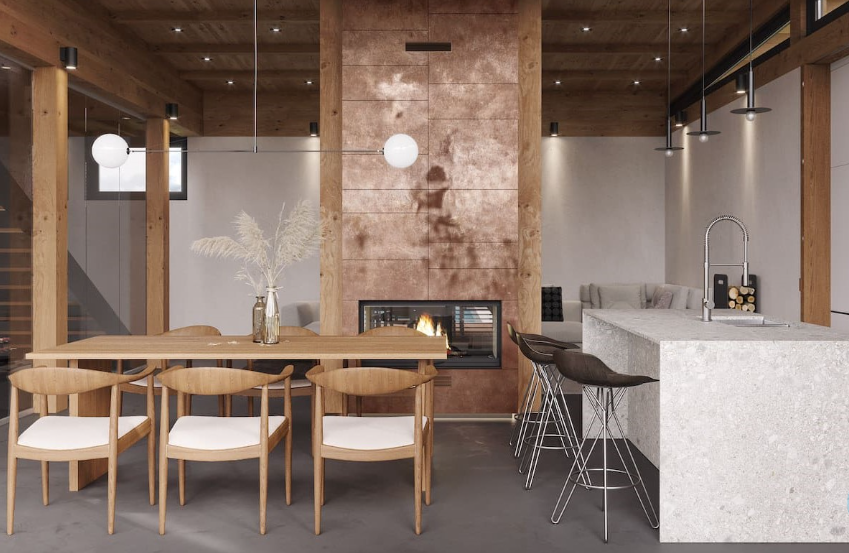 - на кухне можно поставить камин, печь или любой другой очаг;
