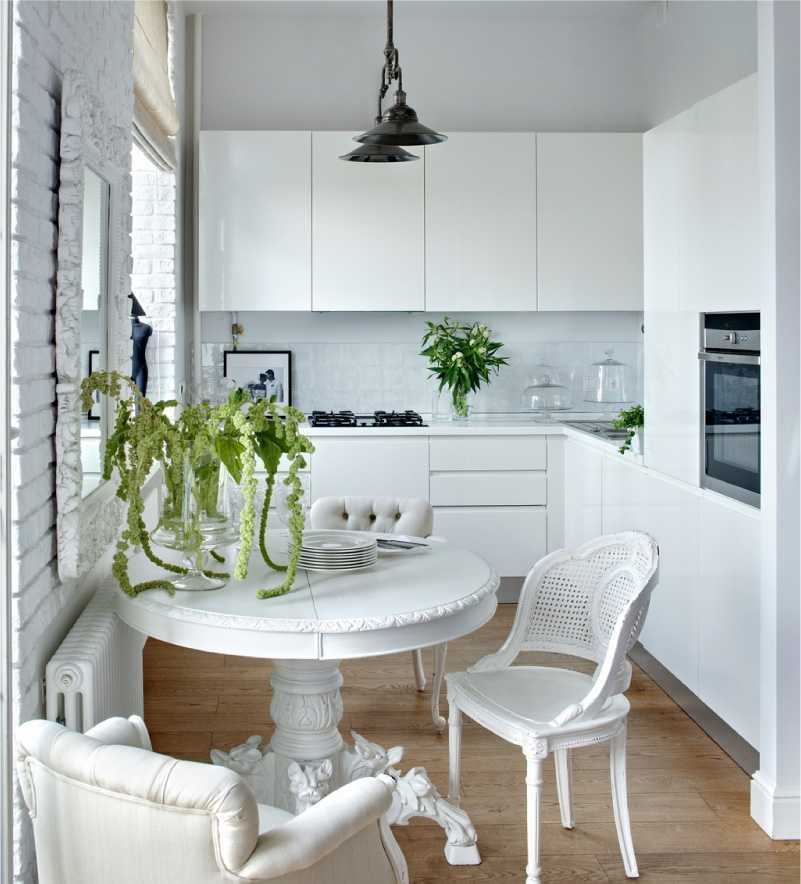 Например, глянцевая белая кухня на фоне кирпичной белой стены с белым стеклянным фартуком будет выглядеть очень стильно и совсем не как операционная.