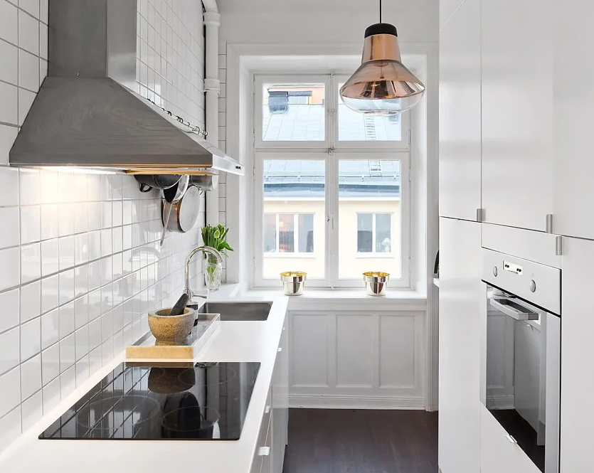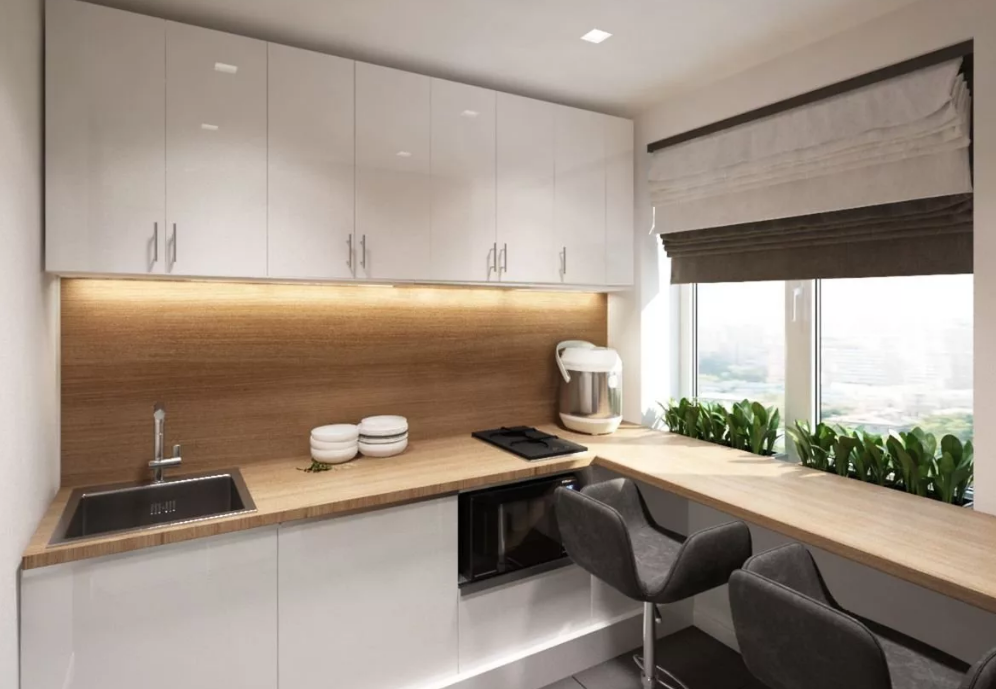 Идеальный вариант, если в кухне планируется только приготовление еды, а столовая зона расположена в другой комнате. Впрочем, при подобной планировке будет достаточно места для создания обеденной зоны непосредственно в кухне.